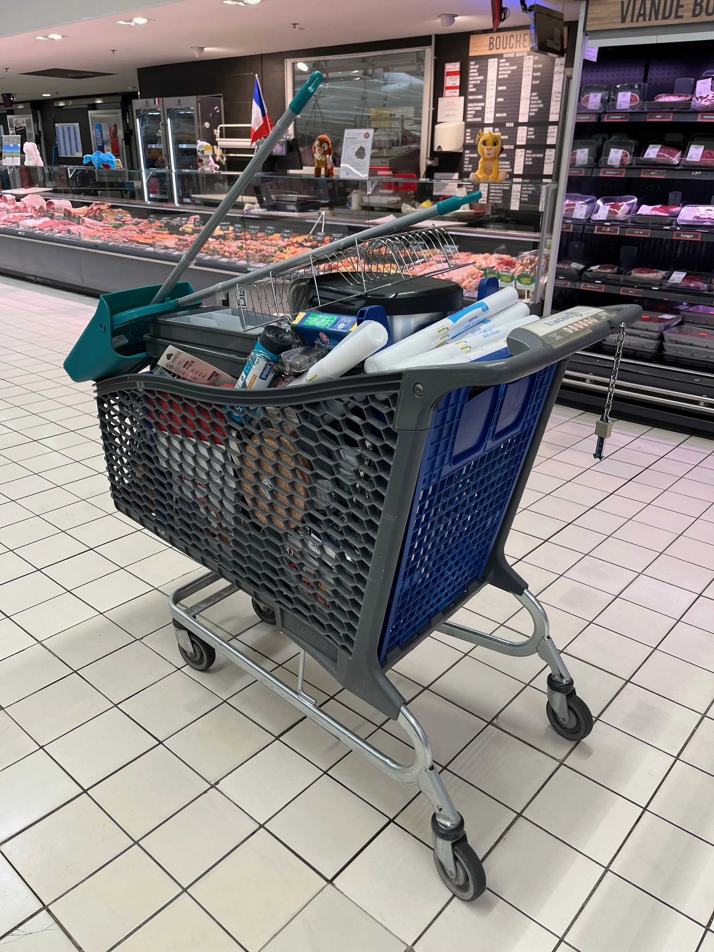 We went to the local grocery store for not only food, but basic necessities for the maison. There’s a photo of one shopping cart filled with things such as a broom and dustpan, a dish drying rack, drinking glasses, rolls of shelf liner paper, and so much more. All that would fit into one cart. There will be more trips to accomplish the tasks of having household implements.