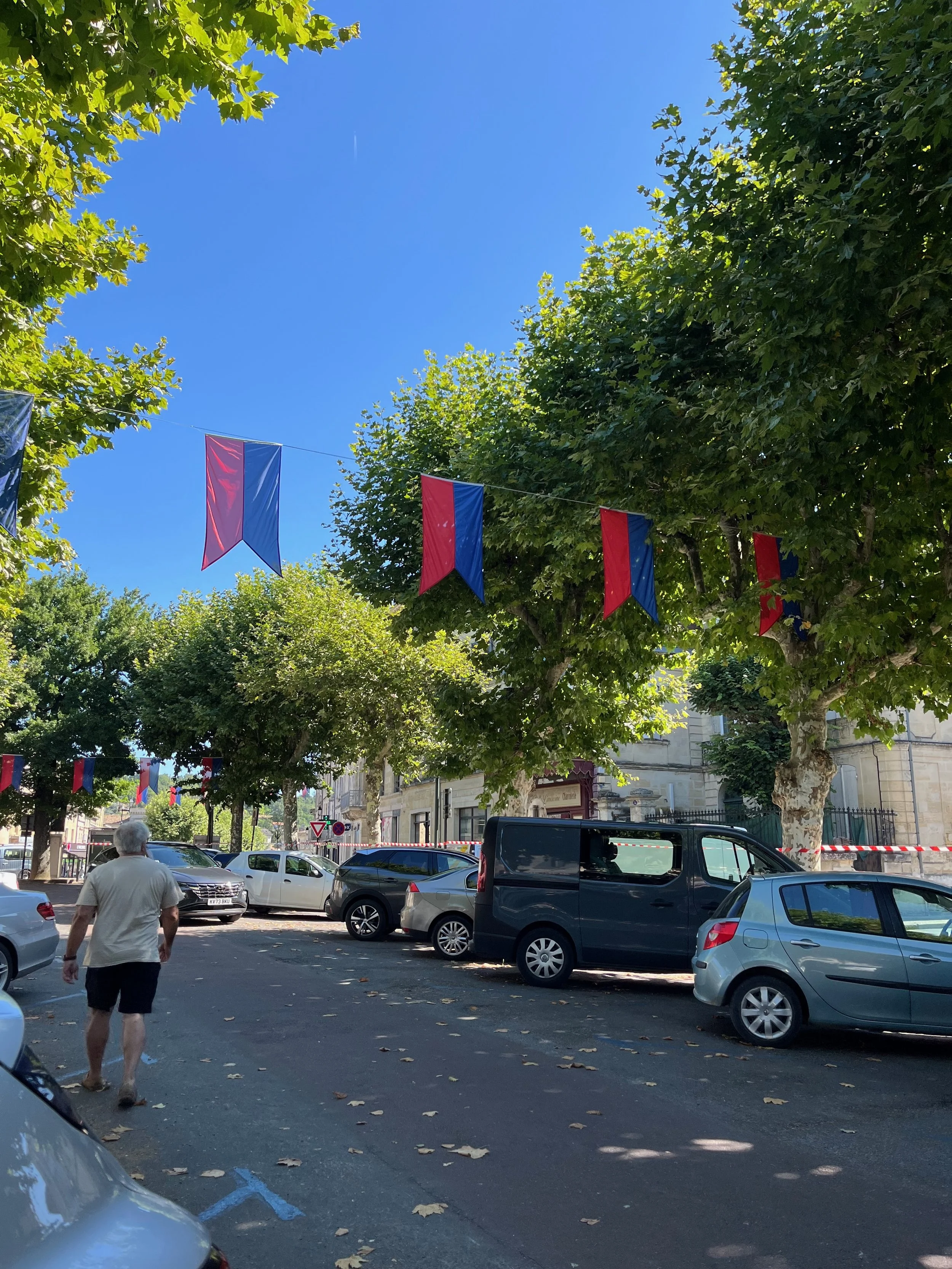 Oh, and here’s a picture taken from the center of Castillon-la-Bataille where you can see the flag that adorns our wine labels. Dinner tonight is grilled magret de canard and pommes frites made in duck fat. Yes, I love eating duck! Cheers!